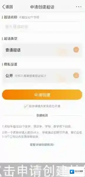 3、再依次输入超话名称、类型,并设置隐私权限,最后点击申请创建按钮即可。