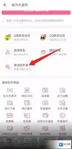 3、接着点击页面左上角的开通大会员按钮,进入成为大会员页面,再下拉页面点击激活码开通选项,进入大会员激活码页面,