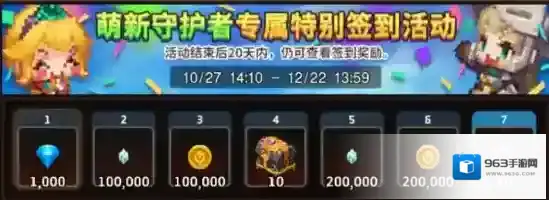 3) 萌新守护者专属特别签到-开启时间:10月27日维护结束后~ 12月22日维护前-萌新守护者在10月27日更新后登录游戏即可触发专属特别签到活动-满足以下条件的玩家为萌新守护者:10月13日00:00后创建角色的守护者