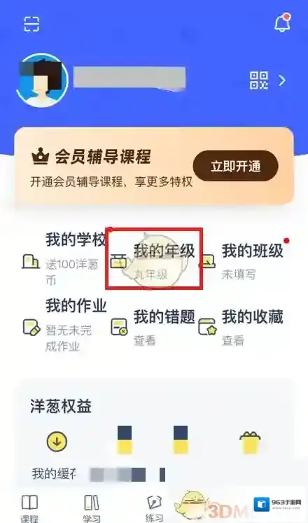 1、在洋葱学院我的页面,点击以下位置处的我的年级(如图所示)。