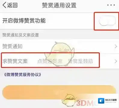 4、打开微博欣赏功能右侧开关,设置欣赏文案即可。
