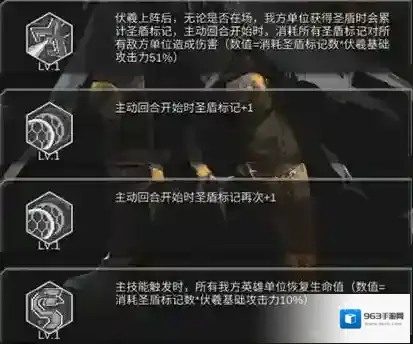 蚩尤技能概括:蚩尤的技能是场上有圣盾生成或破裂都会令其增加攻击力,无论在不在场都可以进行圣盾累计。如果圣盾叠加够多,可以一次性收割。