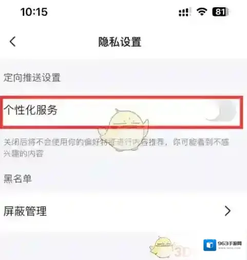 打开站酷APP,并登录你的账号。接着,进入“我的”页面,然后点击页面左上角的三条横杠图标,以打开侧边栏菜单。在侧边栏菜单中,找到并点击“设置”选项。进入设置页面后,继续点击上方的“隐私设置”选项。在隐私设置页面中,你可以轻松找到“个性化服务”选项,点击其后的按钮将其关闭即可。