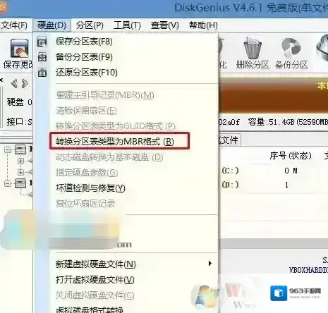 转GPT分区为MBR格式:删除分区后,装换硬盘分区表类型 为 MBR 格式,同样还是从“硬盘”–“转换分区表类型为MBR格式”,然后保存更改(以下为图示,此时该项为可点,如不可点说明已经转换好了。),如图: