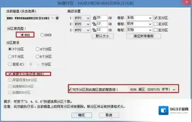 3、转换完成后,执行快速分区,分区大小几磁盘个数自己选择,确保分区表类型为MbR ,及勾选了重建主引导记录MBR,按下确定后开始分区(对了,如果是固态硬盘可要4K对齐一下哦);