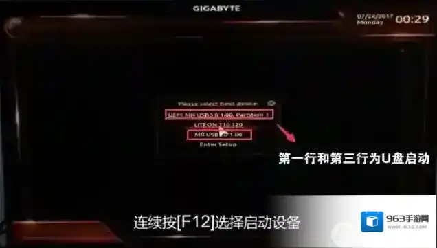 二、技嘉B250主板U盘启动1、插入我们制作好的U盘启动盘,然后重启不停的按F12,这时会出现启动项选择菜单,我们会出现有UEFI的U盘和没有U盘,装Win7我们选择不带UEFI的启动;
