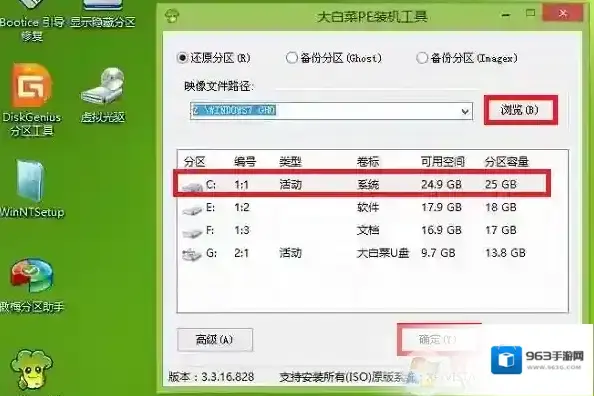 四、安装Win7系统1、运行PE桌面上的一键装机工具,然后选择Win7.GHO镜像,并且选择C盘,然后确定安装即可。