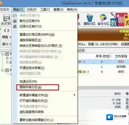 三、硬盘分区MBR方式安装Win7的话,硬盘要转换为MBR模式,如果已经是MBR的,不需要分区可以跳过这一步1、打开上图的Diskgenius分区工具;打开Diskgenius后,选择笔记本硬盘,然后点击“硬盘”–“删除所有分区“,删除前确保资料已经转移,删除后,点击保存更改;