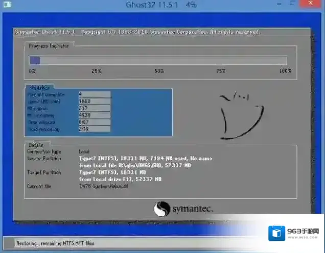 3、GHOST恢复系统到C盘中,恢复完成后就会重新启动开始Win7的安装过程,接下去我们等待就好了,无需操作。