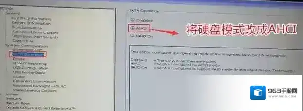 5、注意:切换到system configuration项,如果硬盘模式是ahci,将sata operatior硬盘模式改为ahci模式,否则安装win7会同现0x0000007b蓝屏,改了后选择退出并保存BIOS,如下图所示;