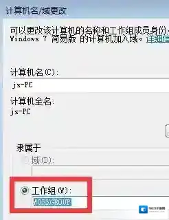 4、弹出的“计算机名/域更改”界面中,修改“工作组名”为同一名称,不知道是什么工作机组可以在别的电脑上也一样操作即可看到‘;