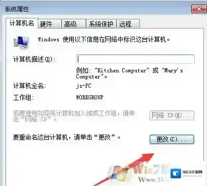 3、在打开的“系统属性”窗口中,切换到“计算机名”选项卡,点击“更改”按钮,如图所示: