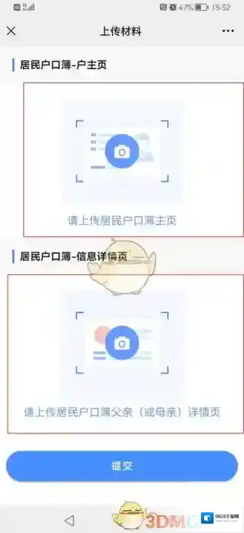 3、上传相关材料:依次点击页面中摄像头图标上传居民户口簿主页和新生儿父亲或者母亲的居民户口簿详情页。