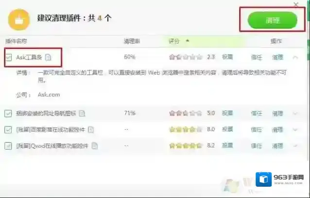 4、勾选ASK工具条,然后点击清理;清理时要关闭IE浏览器哦。