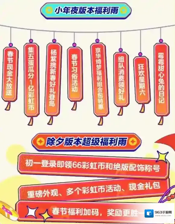龙年行大运,福利送不停。2月2日起,春节版本20余弹福利将陆续上线,重磅外观、130+彩虹币、海量现金红包统统免费领!其中2月9日更将落下超级福利雨,大年初一限时登岛还将即领66彩虹币和绝版配饰称号,福利加码更胜一筹!
