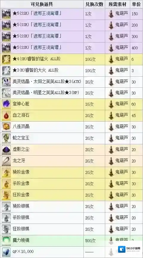 2、兑换奖励:在本次活动期间玩家击败小怪会掉落活动素材鬼葫芦,这也是本次活动中的唯一活动材料,可以用来兑换商店中的五星礼装以及突破素材。