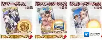 装备可在活动道具交换的活动限定概念礼装「★5(SSR)ダイブ?トゥ?ブルー」的话,「精选糖球」、「泡麵」、「康诺特币」的掉落获得数会提升。