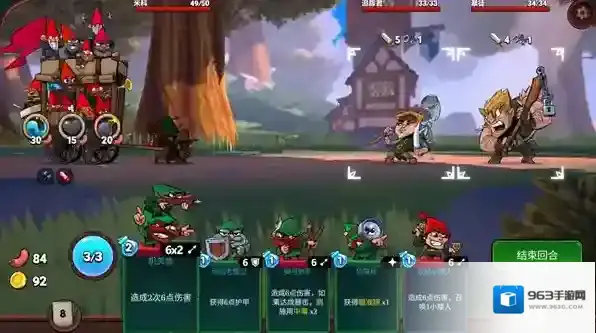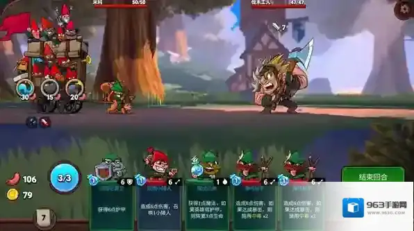 5、进入战斗后玩家需要使用不同的小矮人卡牌击败对手,每个卡牌都会消耗1点魔法,最多有3点魔法可以使用。
