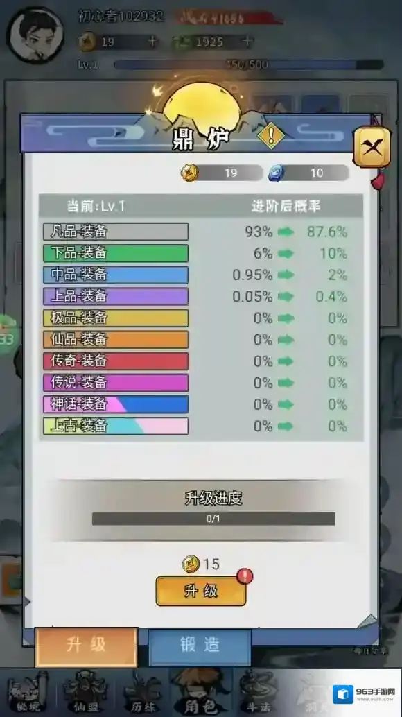 4、点击炉子下方等级,可以将鼎炉升级,提高稀有装备爆率。