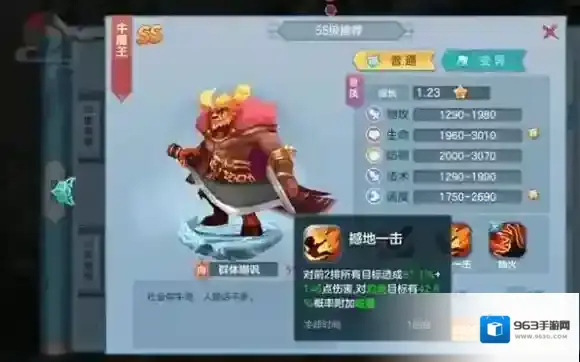 这是单独的一个,之所以推荐是因为它的天赋技能,带嘲讽带眩晕带带灼烧,万金油般的全能小伙伴。牛魔吼啸是控制技,憾地一击可对灼烧目标晕,且冷却回合只有1回合,牛魔王自身还带有被动技灼烧,尤其适合搭配带克制灼烧效果的铁扇公主和红孩儿。