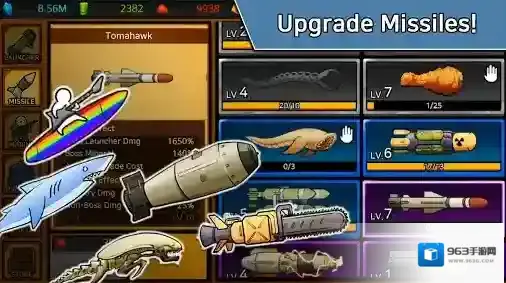 3、每过10关都会有个性的BOSS出现,不断的提升你的发射器和导弹,去消灭更多的BOSS。