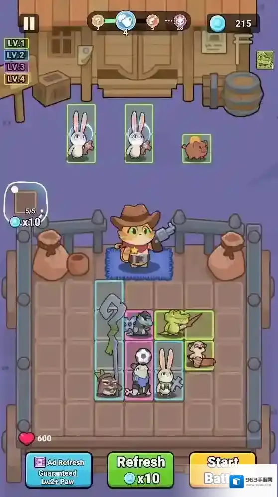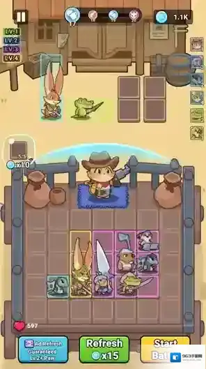 2、进入关卡后玩家可以将初始伙伴放入背包,相同的伙伴可以合并提升等级,点击refresh可以获得新的伙伴。