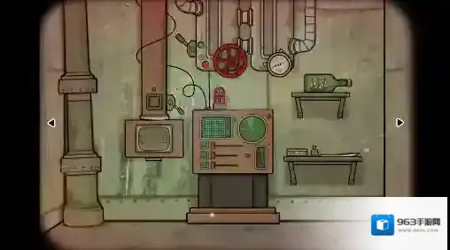 17、潜水艇—操作台视角:点击操作台上方的装置,拉动左侧的把手三次,将深度调整到00。