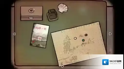 23、潜水艇—操作台视角:点击小桌板上的瓶中船,拔掉软木塞后用(鱼钩)勾住小船的桅杆,多次拉动鱼线后桅杆被拽断掉到了小桌板上,从桅杆的根部取出一张卡片,根据卡片上的提示在地图上找出对应的点,整合信息后获得坐标:“X:3、Y:4、D:50”;点击操作台,将获得的坐标输入。