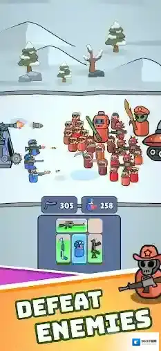在战斗中,我们需要合理的部署自己的阵容,并通过合成的方式来解锁更多强力的武器,让自己的士兵们能够拥有更强大的战斗力,消灭更多的敌人!除了局内的各种部署之外,局外也可以对武器、技能、士兵进行升级,提高整体战斗力,去挑战更多困难的关卡!
