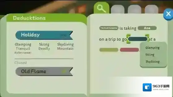 你将扮演主角来收集各种线索解开案件,通过和NPC对话来获得有用的线索,将这些线索填入空白区域来获得有用的信息,一点一点探索和互动来解开谜题获得真相。