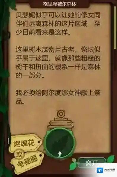 1、如果你选择了驱魔仪式,前往N9举行驱魔仪式,在祭坛上放置以下植物:恶魔睡帽、疾网藤、寡妇哀、长羞草和古翠草。