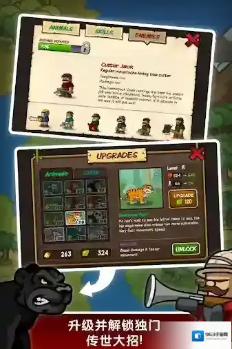 2、发现并升级猩猩、熊猫和这个野外世界里其他更多独特的角色和技能,它们都有自己特殊的能力。