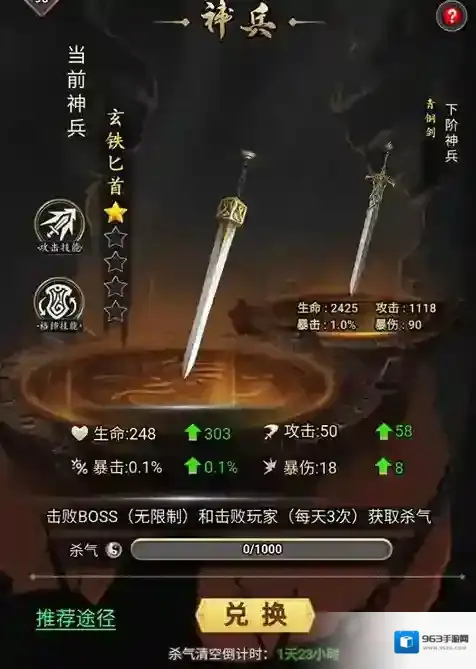 消耗杀气可升级神兵,随着神兵等级的不断提升,神兵外观将焕然一新,同时伴随着属性的飙升。每次的进化都是一次剑术的巅峰演绎,将助你在战场上傲立不败!