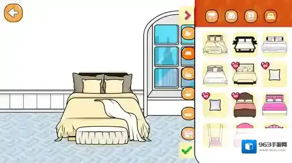 3、进入房间后点击右上角的按钮可以进入装饰界面,在这里你可以自由更换不同的家具物品。