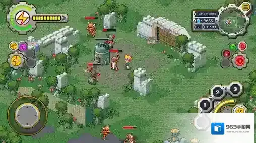 6、当放好建筑后点击左上角的红色按钮可以开始战斗,你可以操控角色亲自上阵或者看着炮塔消灭你的敌人。