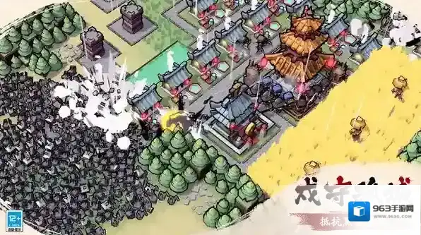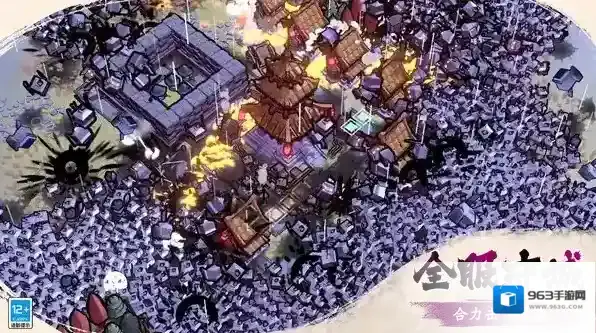 1、采用数字水墨绘画技术,还原传统山水画 勾、皴、点、染 的笔墨技法,城池楼宇、山水林木、士兵敌军均以水墨笔触呈现,搭配散点透视的场景设计,营造出 如入古画 的沉浸式视觉体验。墨水方块造型的敌军设计兼具趣味与国风辨识度,爆笑方言配音点缀其中,让严肃的守城题材更添 幽墨 韵味,风格自成一派。