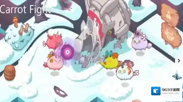 3、雪地场景中,点击箭头指向的粉色角色,释放技能/攻击,完成战斗,解锁新区域、角色。