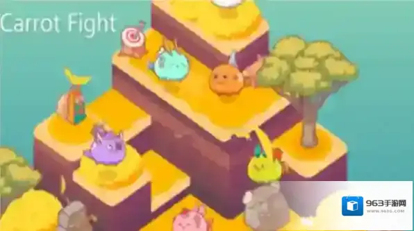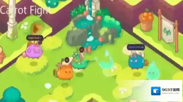 1、在Carrot-Fight首场景,点击箭头指向的紫色角色,触发互动(战斗/任务),推进游戏。