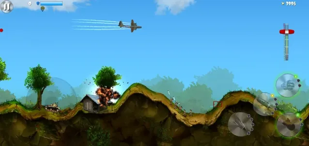 2、游戏中操控飞机在地形上方飞行,利用重力和弹道控制投弹时机,摧毁地面坦克与士兵,注意避开障碍物和敌方火力点。
