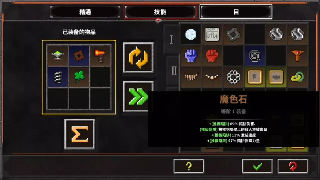 3、进入技能界面,查看并装备“魔色石”等增益道具,提升推板陷阱的伤害与控制效果,增强整体防御能力。