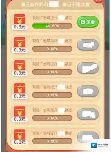 2、进入奖励页,点击“观看”广告,提升进度条,达到条件领取现金奖励(如0.3元)。