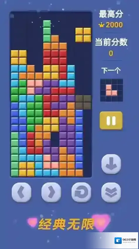 3、让下落方块与底部已堆积方块契合,填满一行或多行时可消除得分,持续累积分数。