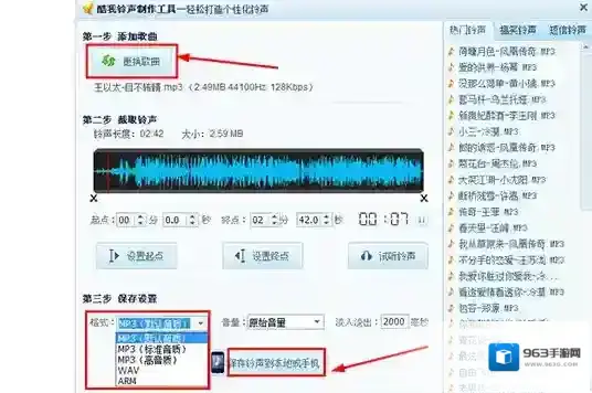 9、将会出现酷我铃声制作工具,首先第一步点击添加刚刚下载的音乐,之后选择截取的起点与终点,这一步不需要去动他,因为是默认全选歌曲的所有长度,最后选择MP3的格式,点击“保存铃声到本地”即可完成MP3格式的转换,如下图所示: