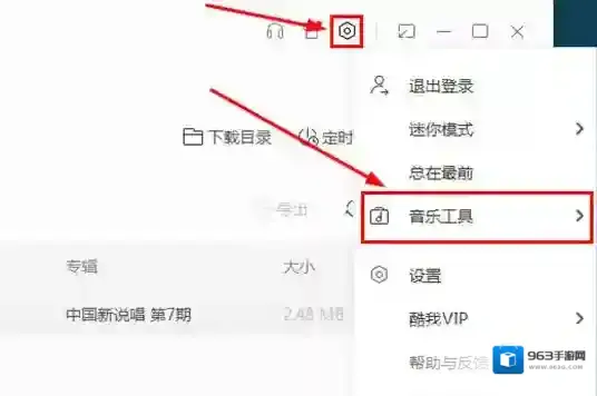 7、返回主界面,点击在右上方的“齿轮”选项,将会出现设置栏目,点击其中的“音乐工具”选项,如下图所示: