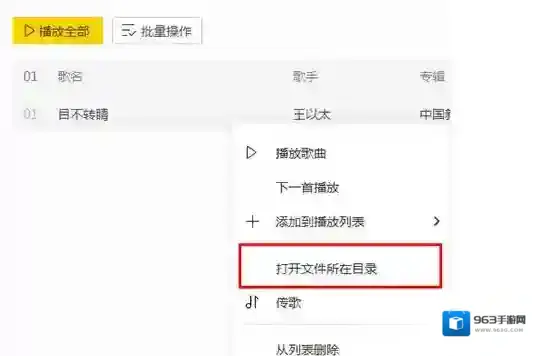 5、之后选择刚刚下载的歌曲,右键点击它,在新出现的下拉栏中选择点击“打开文件所在目录”选项即可打开下载目录的文件夹,如下图所示: