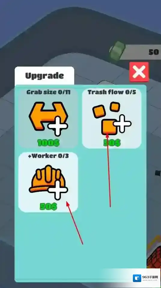 3、“升级功能”,进入升级界面,用金币提升Grabsize(抓取量)、Trashflow(垃圾流速)、Worker(工人数量),优化清理效率。