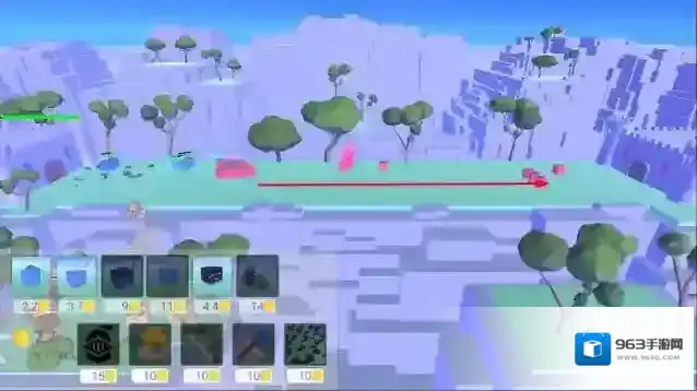2、“布置建筑”,选择建筑类型(如蓝色、粉色建筑 ),放置在方块地形,覆盖敌人路径。