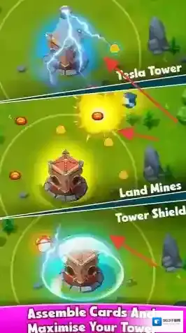 3、“组合卡牌”,装配特斯拉塔、地雷等卡牌,策略搭配,最大化塔楼防御效果。