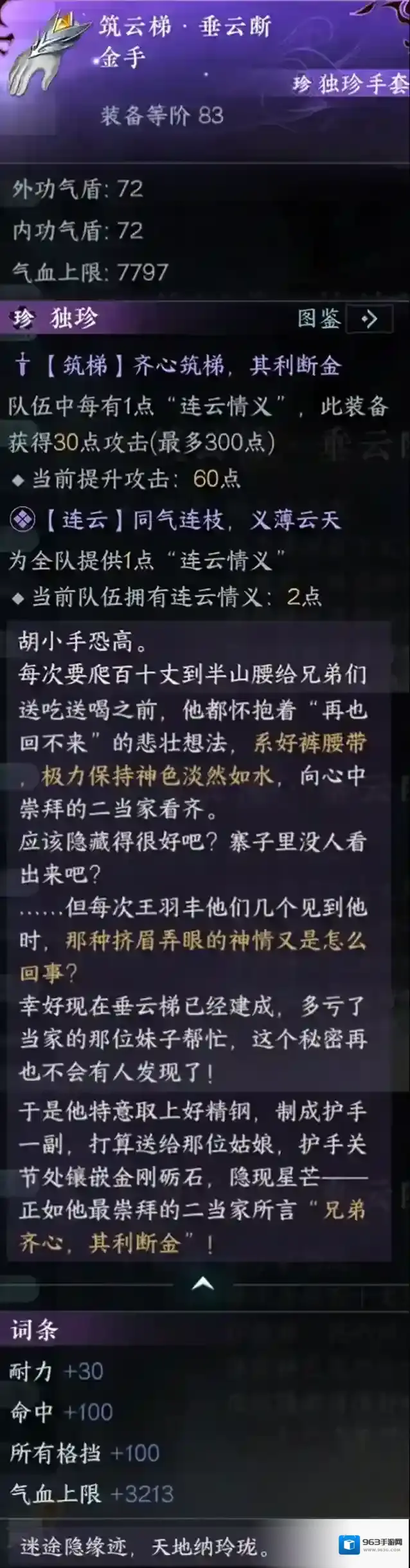 先前,连云寨弟子运货上山需要肩扛手提,实在是效率过低,所以连云寨正着手修建垂云梯。您需要帮助百姓修建垂云梯。修建成功后,您再来连云寨玩就不用爬山啦,可以直接坐垂云梯上升。除此之外,您还可获得独珍装备筑云梯·垂云断金手
