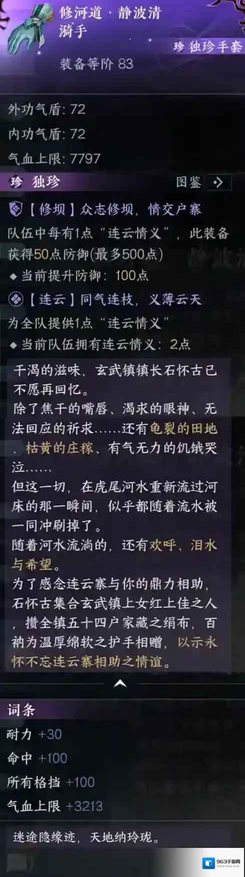 除了大量的游玩项目以及探索谜题外,连云寨还拥有两个服务器“大事件”,包含了探索、解密、战斗等组合玩法。官兵截流虎尾河,导致连云寨的河道干枯。您需要帮助百姓修水坝引水。河道成功通水后,您可获得独珍装备修河道·静波清漪手